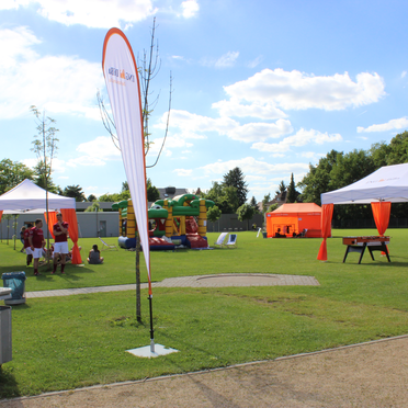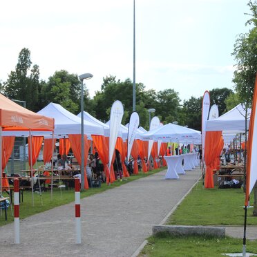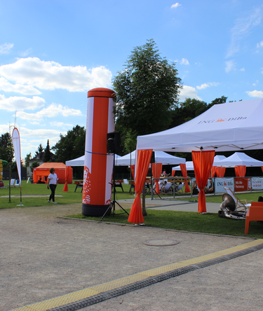 Approximately 400 guests accepted the invitation and found an event location covered in the typical ING-look: From afar, they saw countless Ecotent® pop up gazebos in the white and orange CI-design, circle flags and banners lined the place.