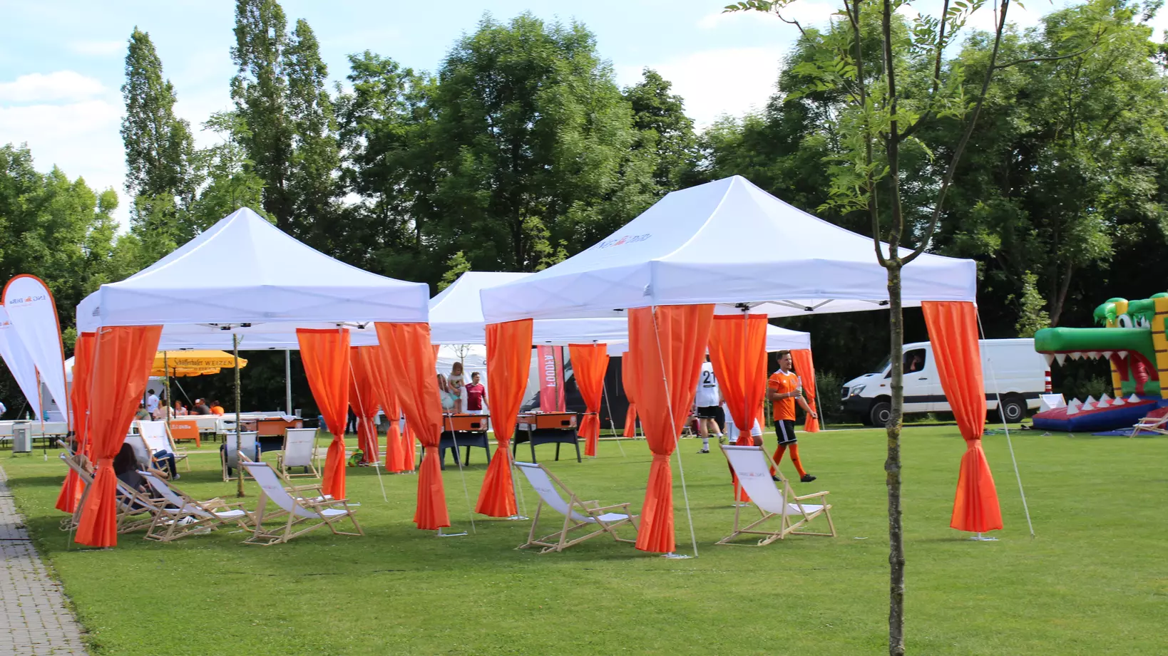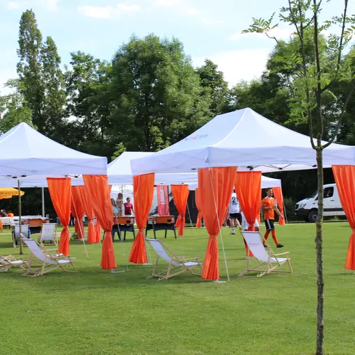 White and orange 6x3 gazebo with decorative pole cover tents and customised ING DiBa flags at sponsored sports event in Germany